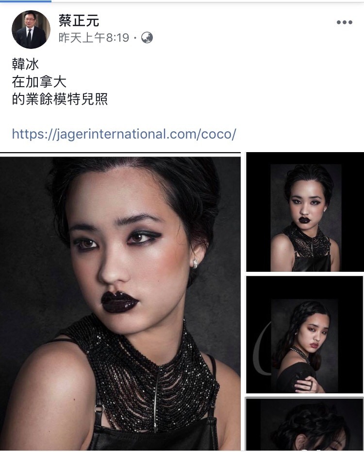 蔡正元PO出韓冰美照。(翻攝自臉書)〔記者洪素津/台北報導〕韓國瑜愛女韓冰因輔選有功,被網友封為「國民黨伊凡卡」,年僅23歲的韓冰備受矚目,韓國瑜也稱讚女兒「這次當選韓冰功不可沒,全因網路戰由韓冰主導」。而韓冰年輕貌美,宛如樂基兒和舒淇綜合體,也為幫忙輔選上政論節目,王世堅被虧見到韓冰害羞不敢正面直視,而昨蔡正元竟也拜倒韓冰裙下,在臉書連PO出34張韓冰美照,讓網友笑虧「不要想吃年輕冰」。蔡正元PO出34張韓冰美照。(翻攝自臉書)蔡正元PO出34張韓冰美照。(翻攝自臉書)蔡正元PO出韓冰美照。(翻攝自臉書)蔡正元PO出韓冰的模特兒照,提供的連結裡,甚至曝光三圍等資料。(翻攝自網路)